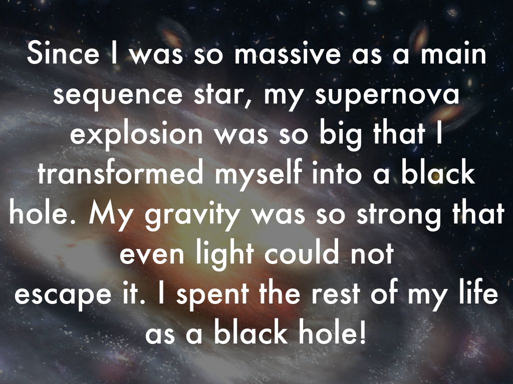 Since I was so massive as a main sequence star, my supernova explosion was so big that I transformed myself into a black hole. My gravity was so strong that even light could not