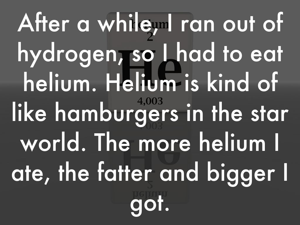 After a while, I ran out of hydrogen, so I had to eat helium. Helium is kind of like hamburgers in the star world. The more helium I ate, the fatter and bigger I got.