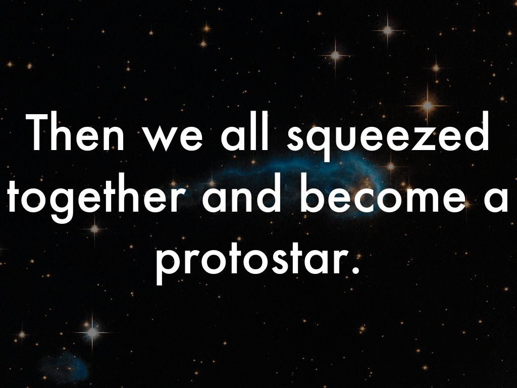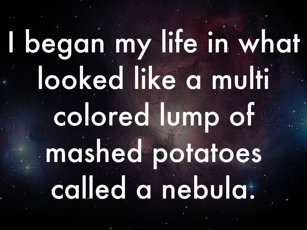 I began my life in what looked like a multi colored lump of mashed potatoes called a nebula.