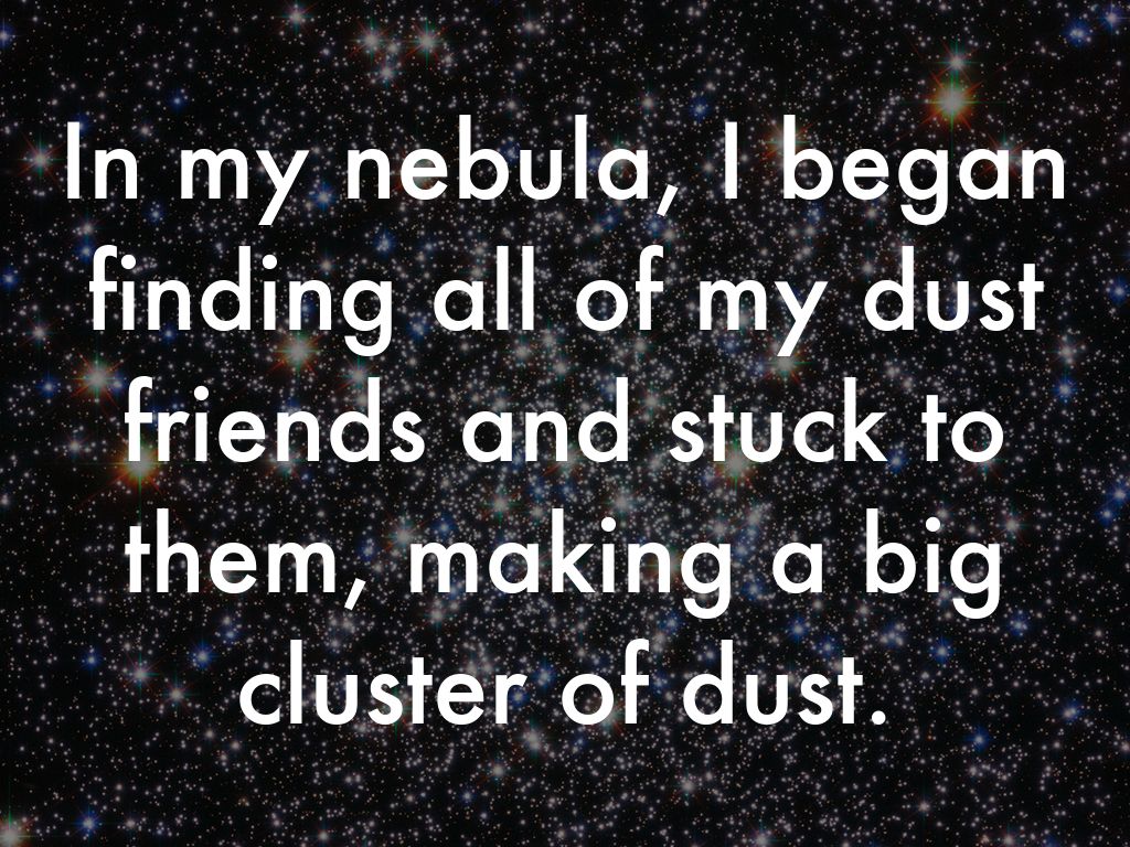 In my nebula, I began finding all of my dust friends and stuck to them, making a big cluster of dust.