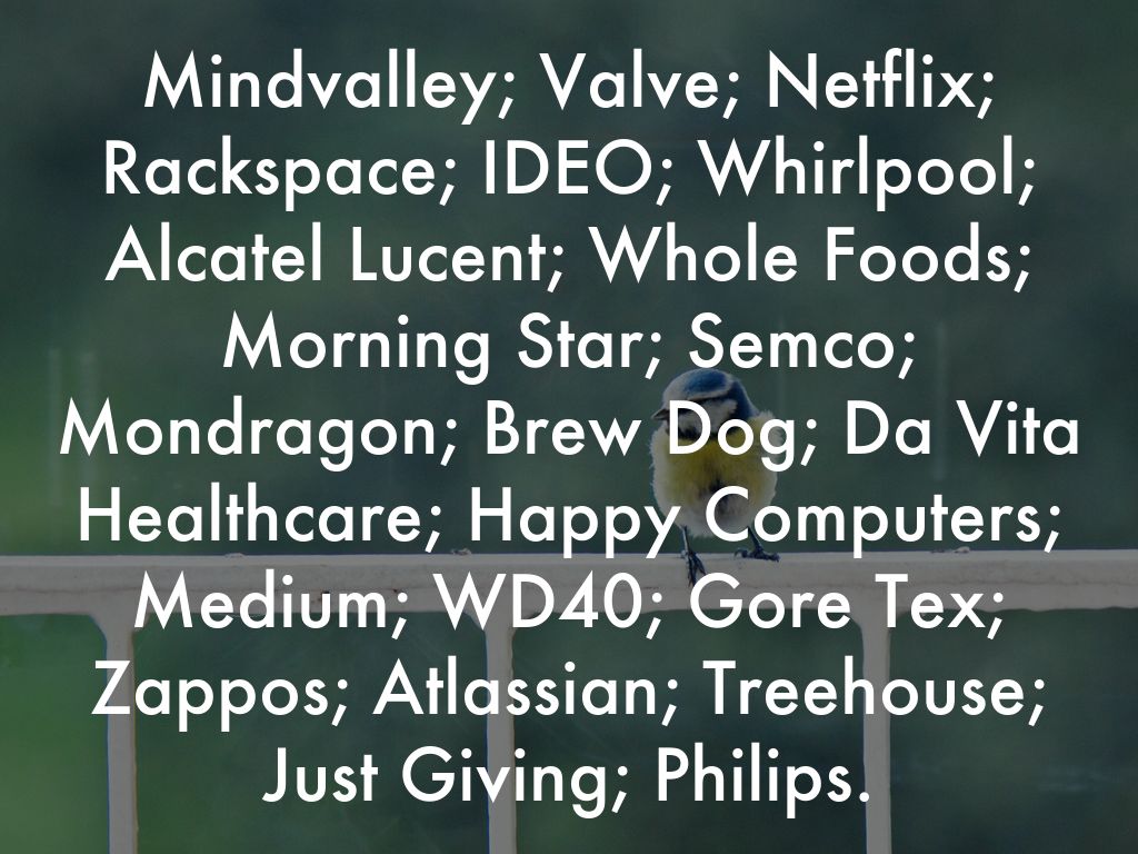 Mindvalley; Valve; Netflix; Rackspace; IDEO; Whirlpool; Alcatel Lucent; Whole Foods; Morning Star; Semco; Mondragon; Brew Dog; Da Vita Healthcare; Happy Computers; Medium; WD40; Gore Tex; Zappos; Atlassian; Treehouse;