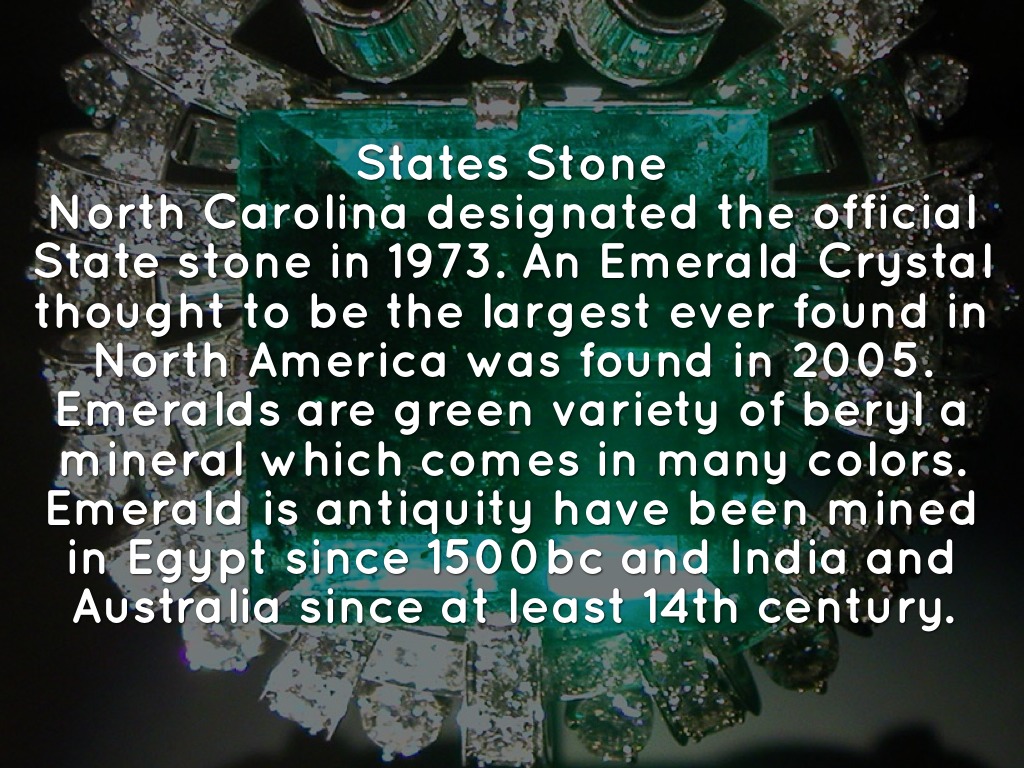 States Stone North Carolina designated the official State stone in 1973. An Emerald Crystal thought to be the largest ever found in North America was found in 2005. Emeralds are green variety of beryl a mineral which comes in many colors. Emerald is antiquity have been mined in Egypt since 1500bc and India and Australia since at least 14th century.
