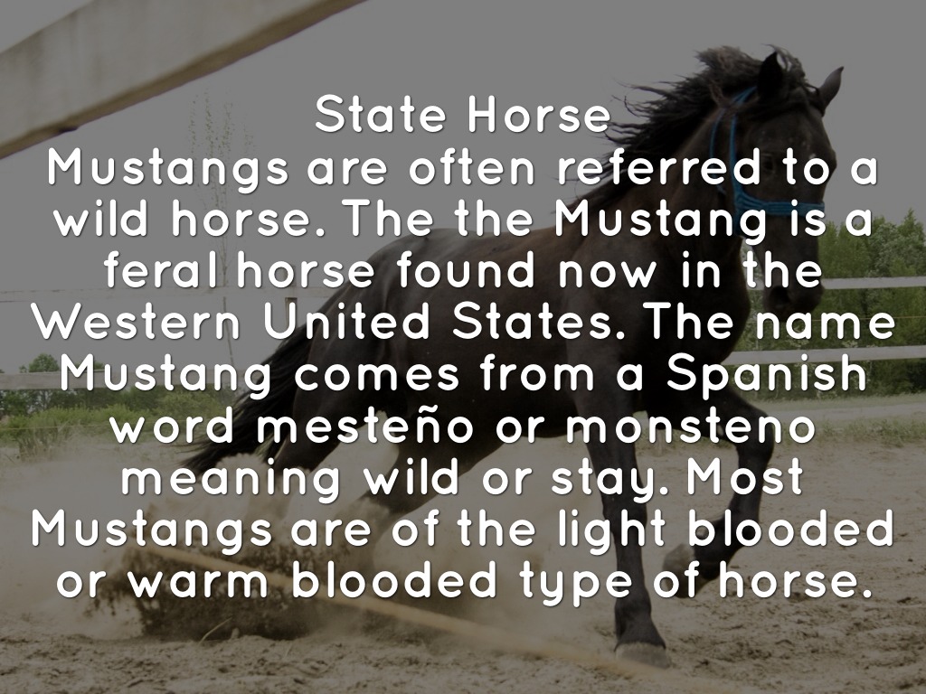 State Horse Mustangs are often referred to a wild horse. The the Mustang is a feral horse found now in the Western United States. The name Mustang comes from a Spanish word mesteño or monsteno meaning wild or stay. Most Mustangs are of the light blooded or warm blooded type of horse.