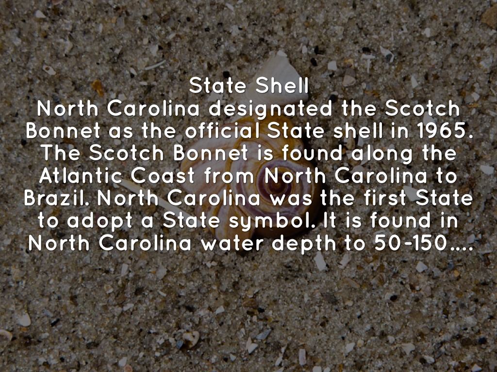 State Shell North Carolina designated the Scotch Bonnet as the official State shell in 1965. The Scotch Bonnet is found along the Atlantic Coast from North Carolina to Brazil. North Carolina was the first State to adopt a State symbol. It is found in North Carolina water depth to 50-150.