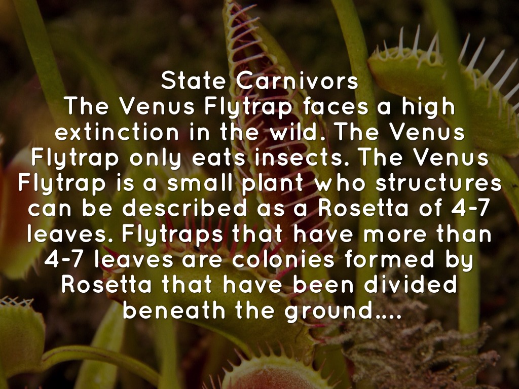 State Carnivors The Venus Flytrap faces a high extinction in the wild. The Venus Flytrap only eats insects. The Venus Flytrap is a small plant who structures can be described as a Rosetta of 4-7 leaves. Flytraps that have more than 4-7 leaves are colonies formed by Rosetta that have been divided beneath the ground.