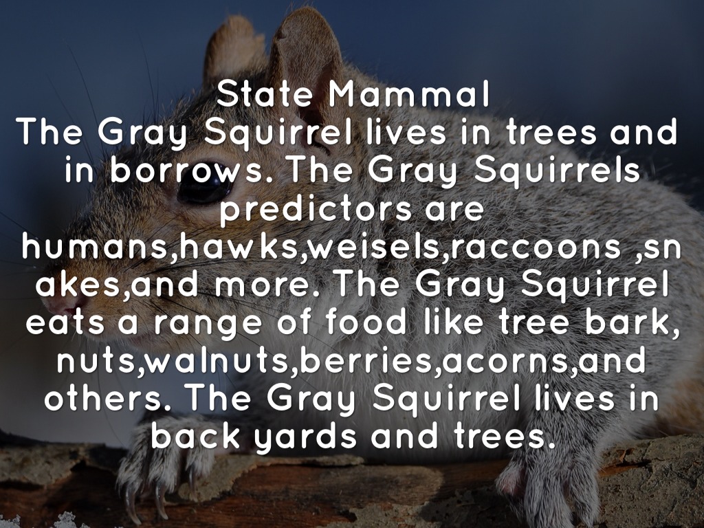State Mammal The Gray Squirrel lives in trees and in borrows. The Gray Squirrels predictors are humans,hawks,weisels,raccoons ,snakes,and more. The Gray Squirrel eats a range of food like tree bark, nuts,walnuts,berries,acorns,and others. The Gray Squirrel lives in back yards and trees.