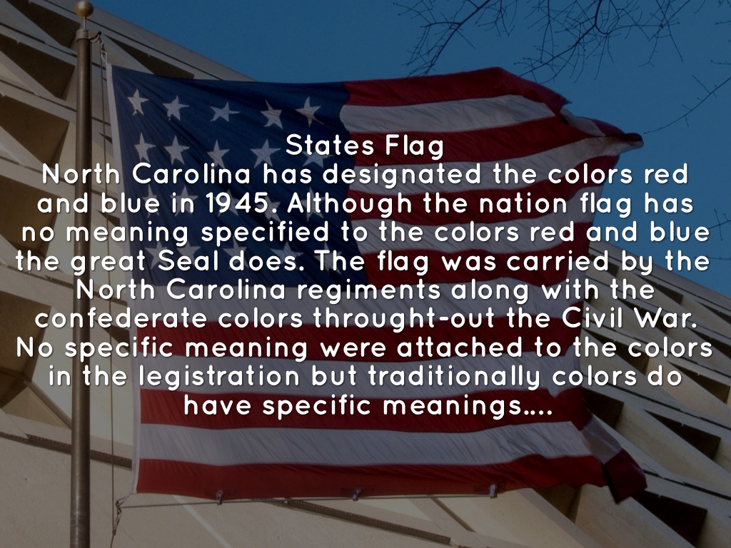 States Flag North Carolina has designated the colors red and blue in 1945. Although the nation flag has no meaning specified to the colors red and blue the great Seal does. The flag was carried by the North Carolina regiments along with the confederate colors throught-out the Civil War. No specific meaning were attached to the colors in the legistration but traditionally colors do have specific meanings.