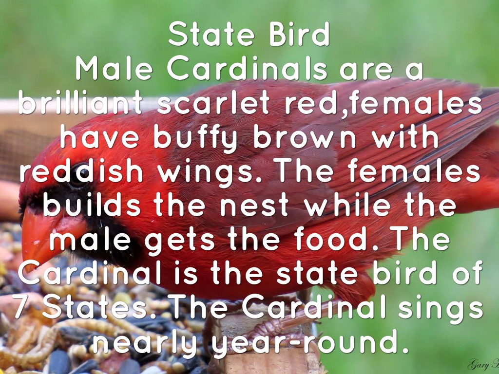 State Bird Male Cardinals are a brilliant scarlet red,females have buffy brown with reddish wings. The females builds the nest while the male gets the food. The Cardinal is the state bird of 7 States. The Cardinal sings nearly year-round.