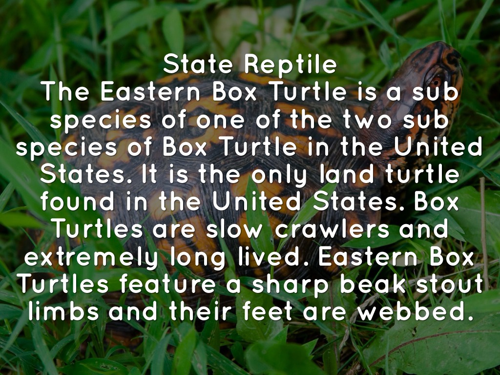 State Reptile The Eastern Box Turtle is a sub species of one of the two sub species of Box Turtle in the United States. It is the only land turtle found in the United States. Box Turtles are slow crawlers and extremely long lived. Eastern Box Turtles feature a sharp beak stout limbs and their feet are webbed.