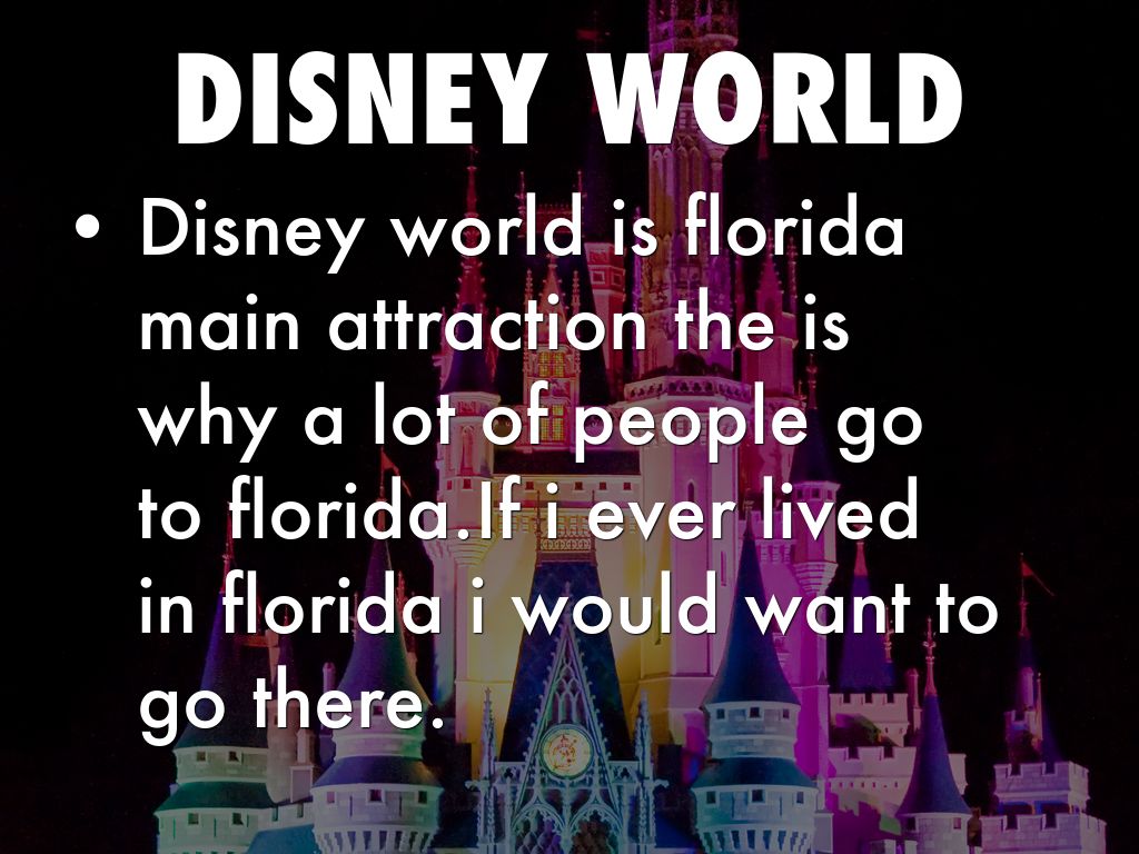 Disney world is florida main attraction the is why a lot of people go to florida.If i ever lived in florida i would want to go there.