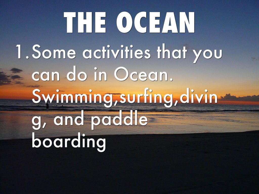 Some activities that you can do in Ocean. Swimming,surfing,diving, and paddle boarding