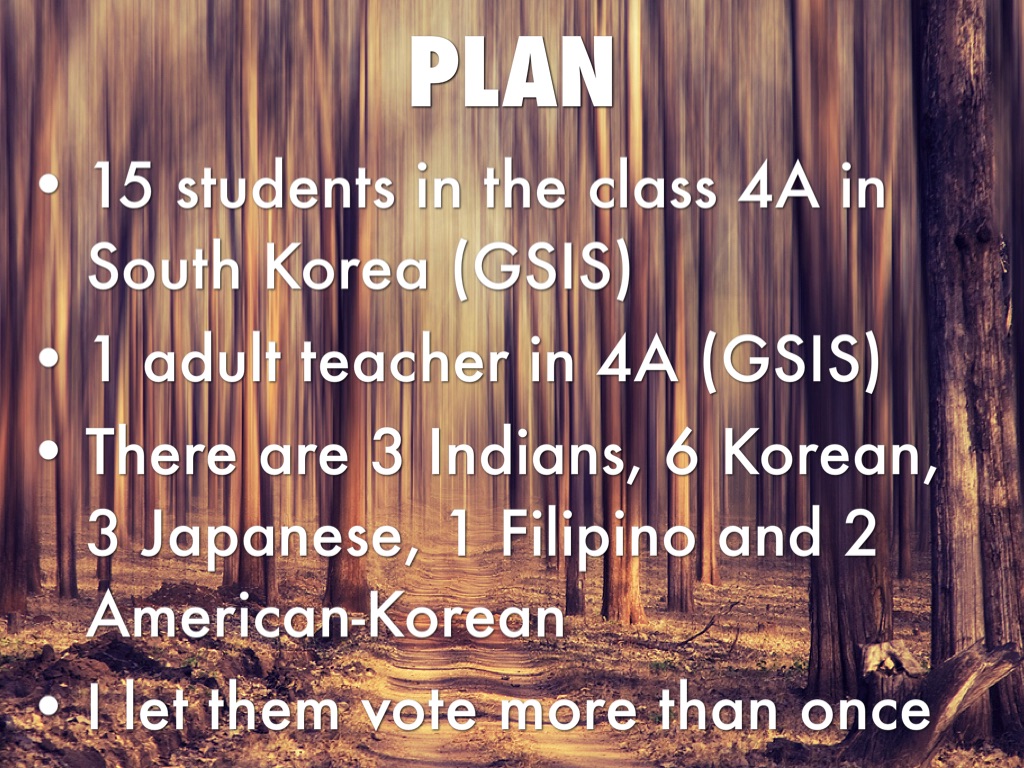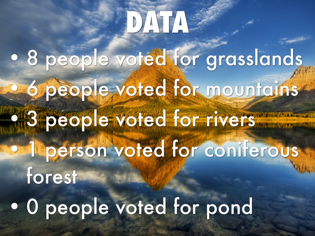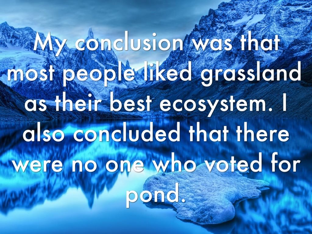 My conclusion was that most people liked grassland as their best ecosystem. I also concluded that there were no one who voted for pond.