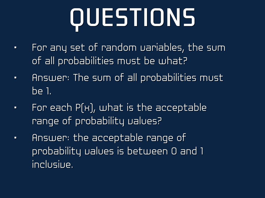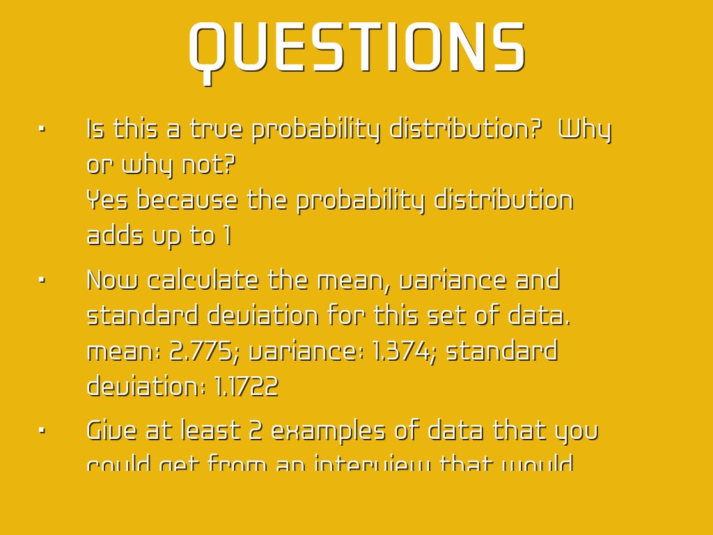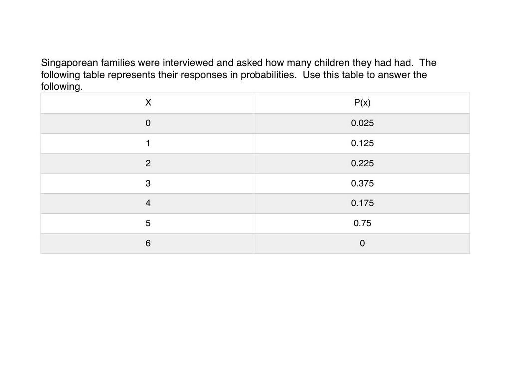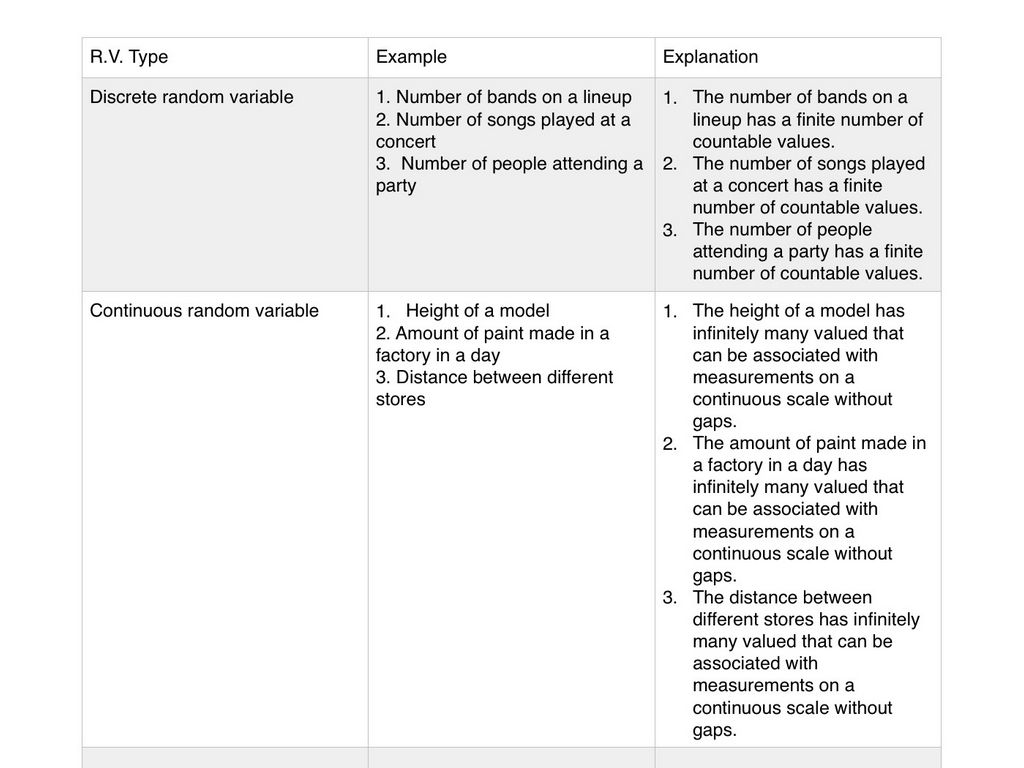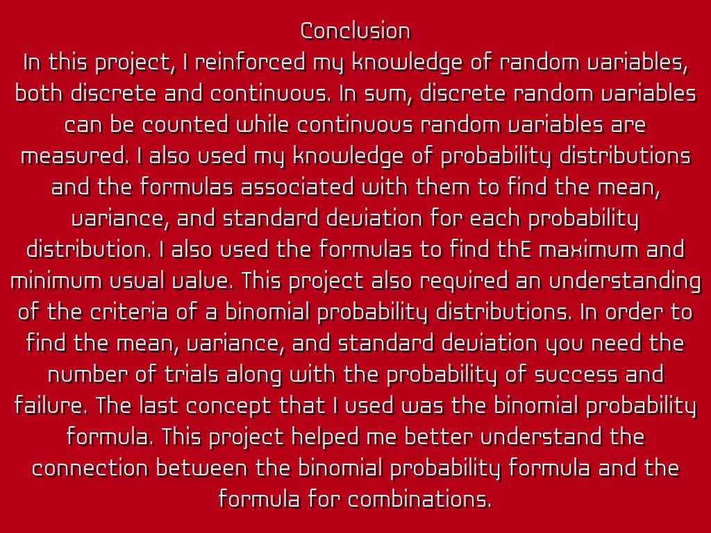 In this project, I reinforced my knowledge of random variables, both discrete and continuous. In sum, discrete random variables can be counted while continuous random variables are measured. I also used my knowledge of probability distributions and the formulas associated with them to find the mean, variance, and standard deviation for each probability distribution. I also used the formulas to find thE maximum and minimum usual value. This project also required an understanding of the criteria of a binomial probability distributions. In order to find the mean, variance, and standard deviation you need the number of trials along with the probability of success and failure. The last concept that I used was the binomial probability formula. This project helped me better understand the connection between the binomial probability formula and the formula for combinations.