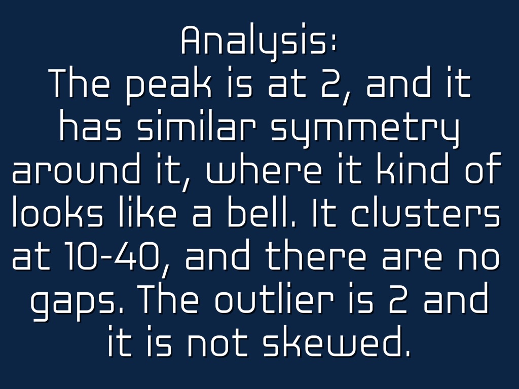 The peak is at 2, and it has similar symmetry around it, where it kind of looks like a bell. It clusters at 10-40, and there are no gaps. The outlier is 2 and it is not skewed.