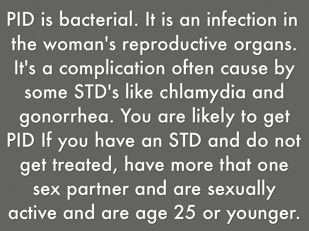 PID is bacterial. It is an infection in the woman's reproductive organs. It's a complication often cause by some STD's like chlamydia and gonorrhea. You are likely to get PID If you have an STD and do not get treated, have more that one sex partner and are sexually active and are age 25 or younger.