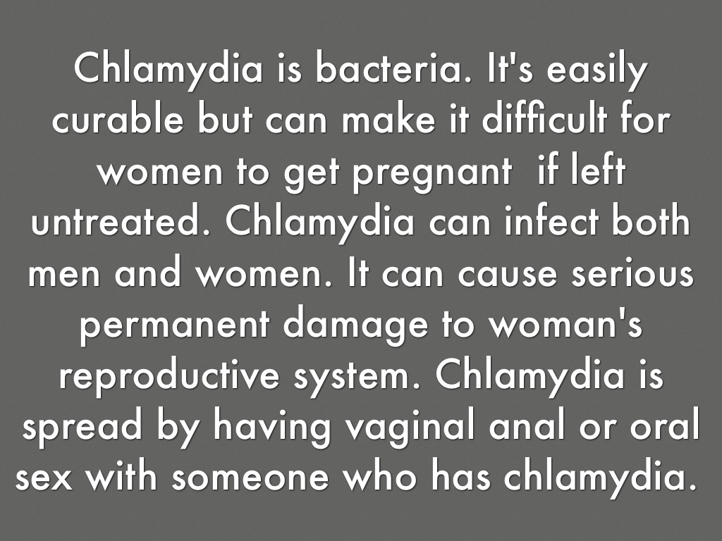 Chlamydia is bacteria. It's easily curable but can make it difficult for women to get pregnant if left untreated. Chlamydia can infect both men and women. It can cause serious permanent damage to woman's reproductive system. Chlamydia is spread by having vaginal anal or oral sex with someone who has chlamydia.