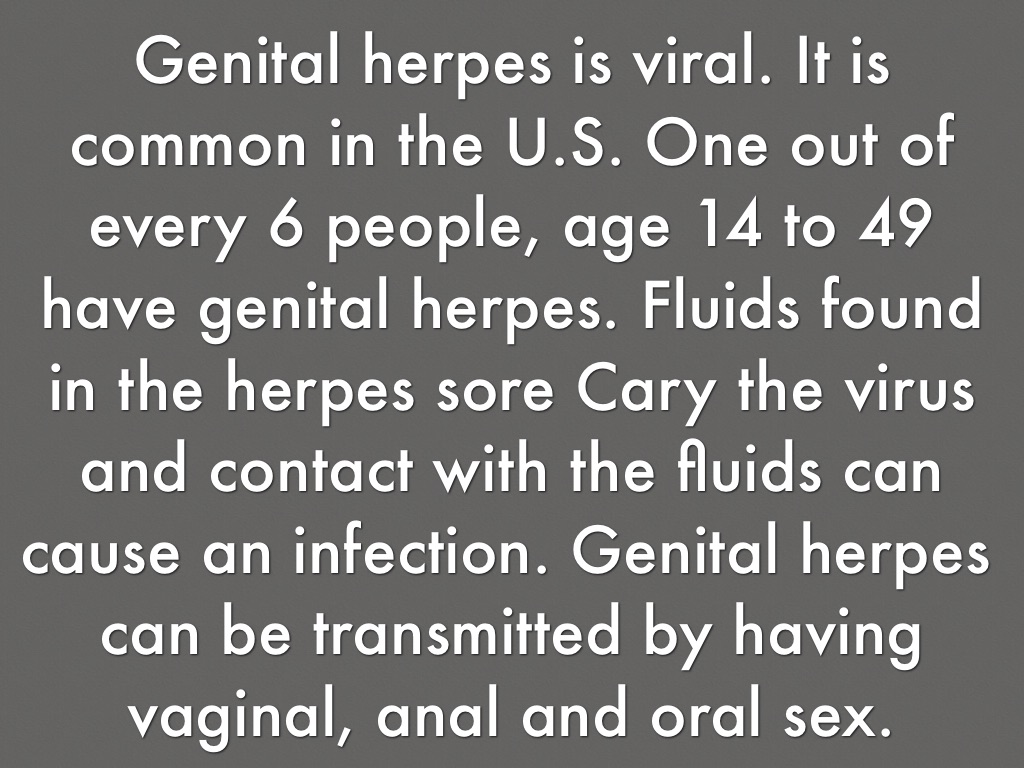 Genital herpes is viral. It is common in the U.S. One out of every 6 people, age 14 to 49 have genital herpes. Fluids found in the herpes sore Cary the virus and contact with the fluids can cause an infection. Genital herpes can be transmitted by having vaginal, anal and oral sex.