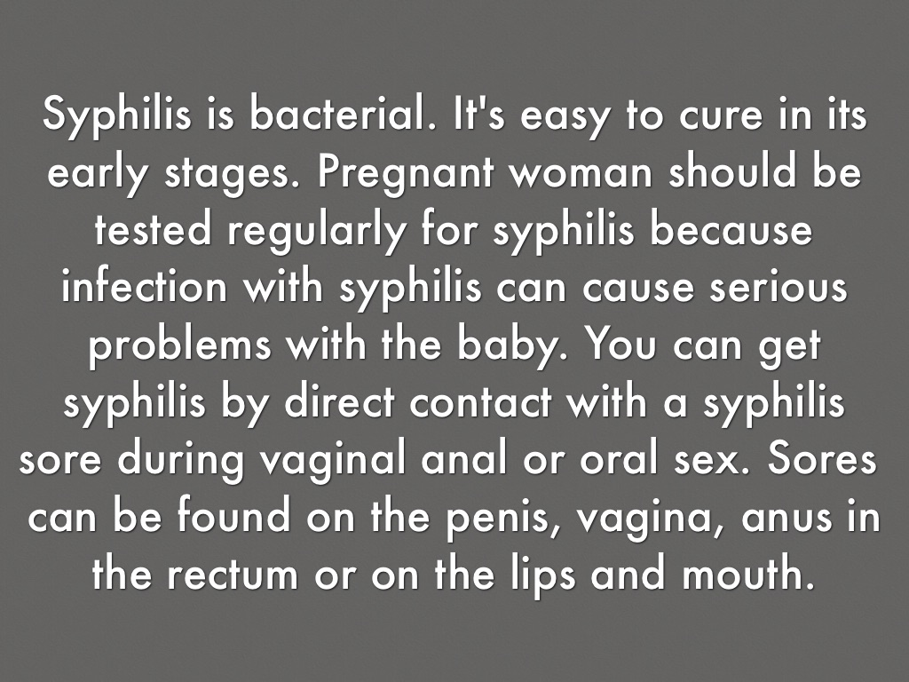 Syphilis is bacterial. It's easy to cure in its early stages. Pregnant woman should be tested regularly for syphilis because infection with syphilis can cause serious problems with the baby. You can get syphilis by direct contact with a syphilis sore during vaginal anal or oral sex. Sores can be found on the penis, vagina, anus in the rectum or on the lips and mouth.