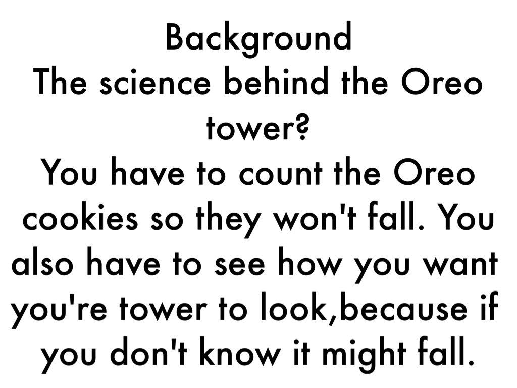 You have to count the Oreo cookies so they won't fall. You also have to see how you want you're tower to look,because if you don't know it might fall.