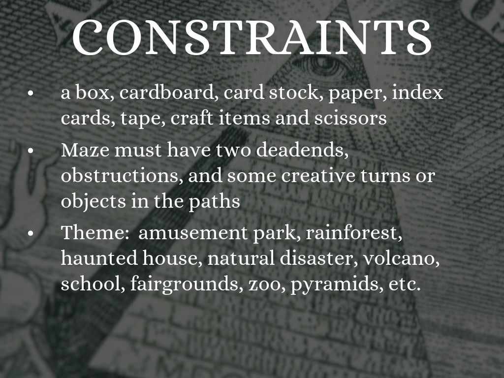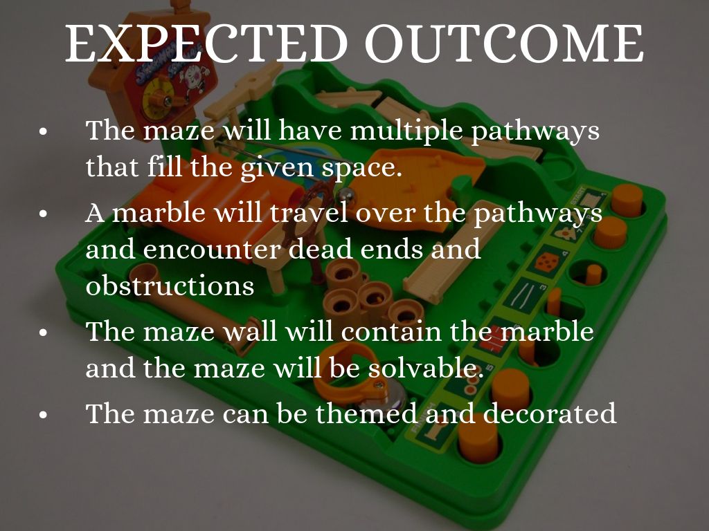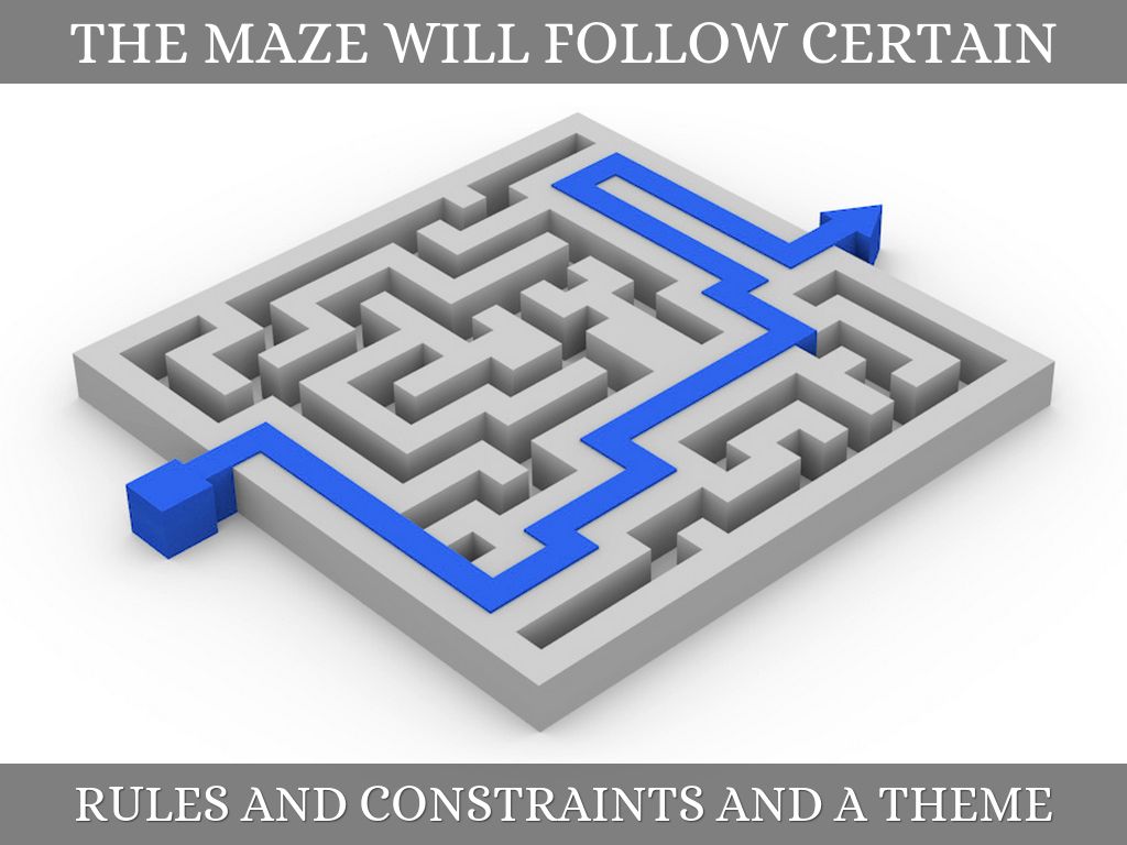 • Maze must have two deadends, obstructions, and some creative turns or objects in the paths