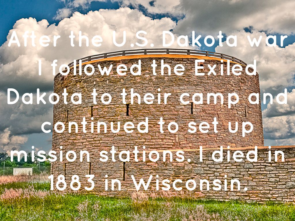 After the U.S. Dakota war I followed the Exiled Dakota to their camp and continued to set up mission stations. I died in 1883 in Wisconsin.
