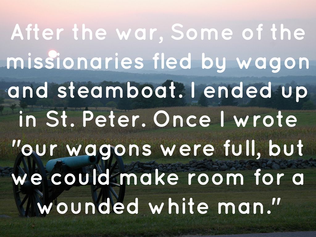 After the war, Some of the missionaries fled by wagon and steamboat. I ended up in St. Peter. Once I wrote "our wagons were full, but we could make room for a wounded white man."