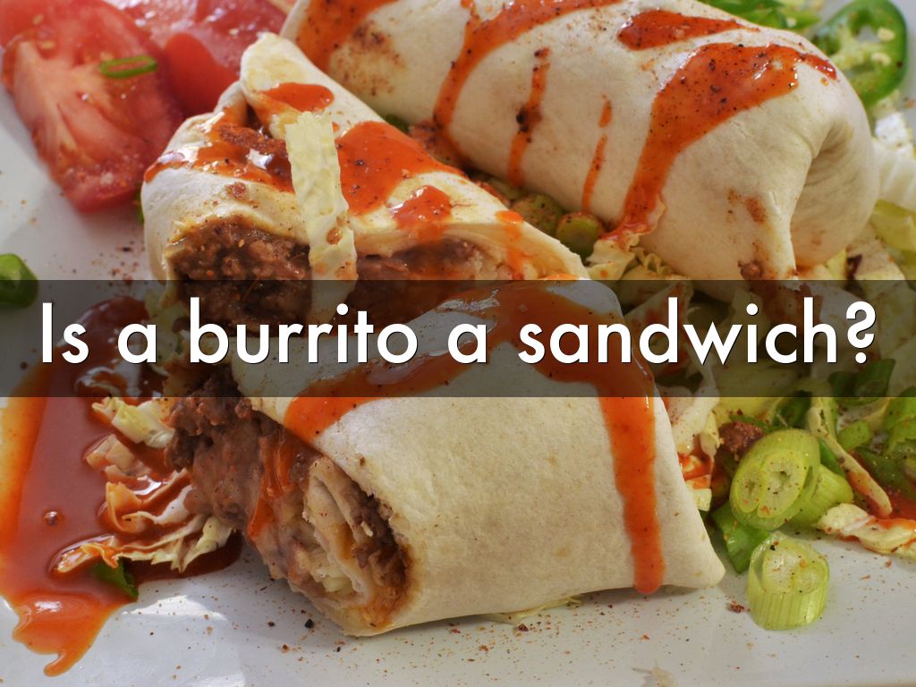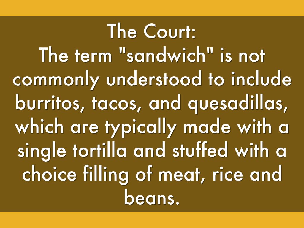 The term "sandwich" is not commonly understood to include burritos, tacos, and quesadillas, which are typically made with a single tortilla and stuffed with a choice filling of meat, rice and beans.