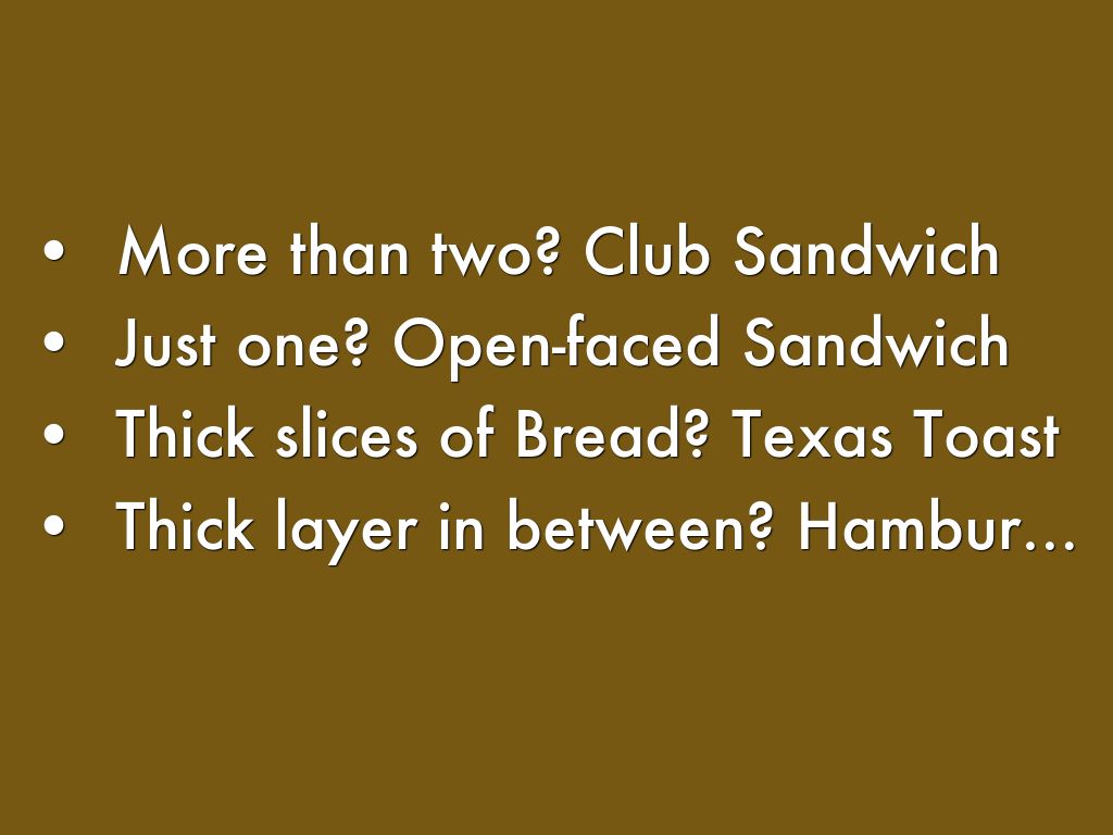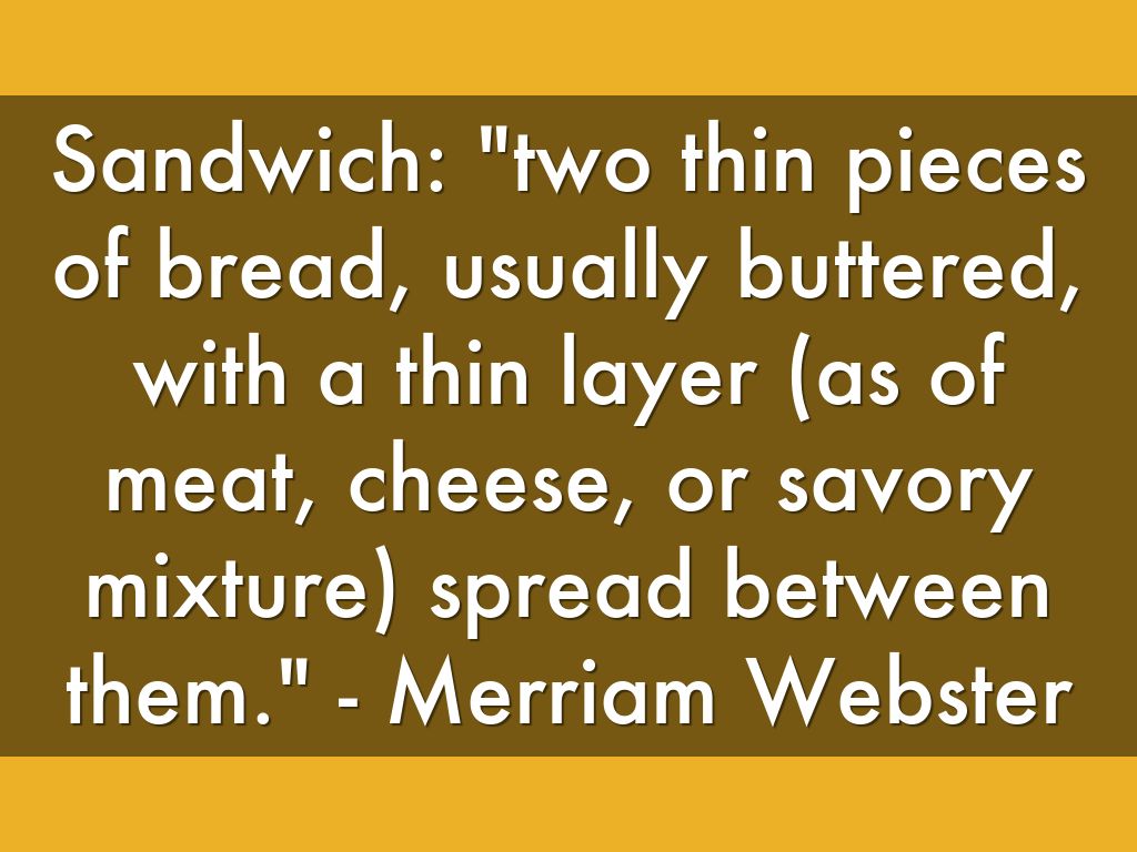 Sandwich: "two thin pieces of bread, usually buttered, with a thin layer (as of meat, cheese, or savory mixture) spread between them." - Merriam Webster