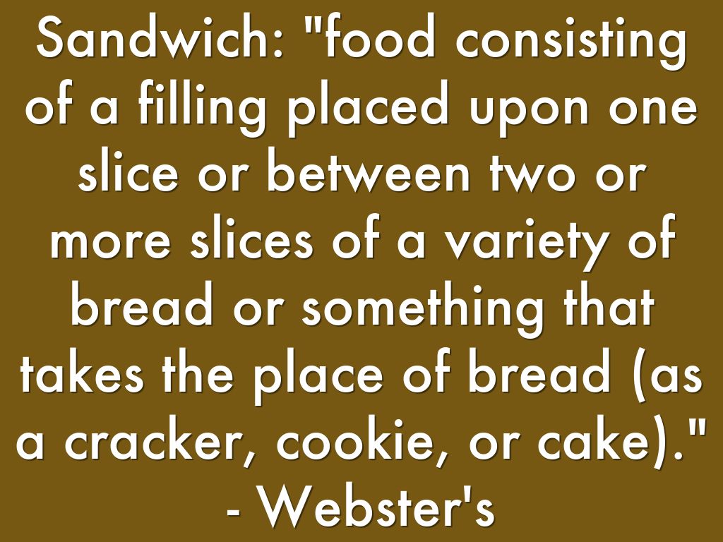 Sandwich: "food consisting of a filling placed upon one slice or between two or more slices of a variety of bread or something that takes the place of bread (as a cracker, cookie, or cake)." - Webster's