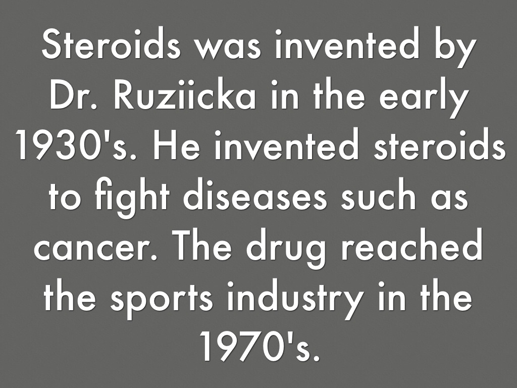 Steroids was invented by Dr. Ruziicka in the early 1930's. He invented steroids to fight diseases such as cancer. The drug reached the sports industry in the 1970's.