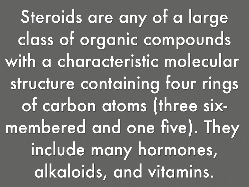 Steroids are any of a large class of organic compounds with a characteristic molecular structure containing four rings of carbon atoms (three six-membered and one five). They include many hormones, alkaloids, and vitamins.