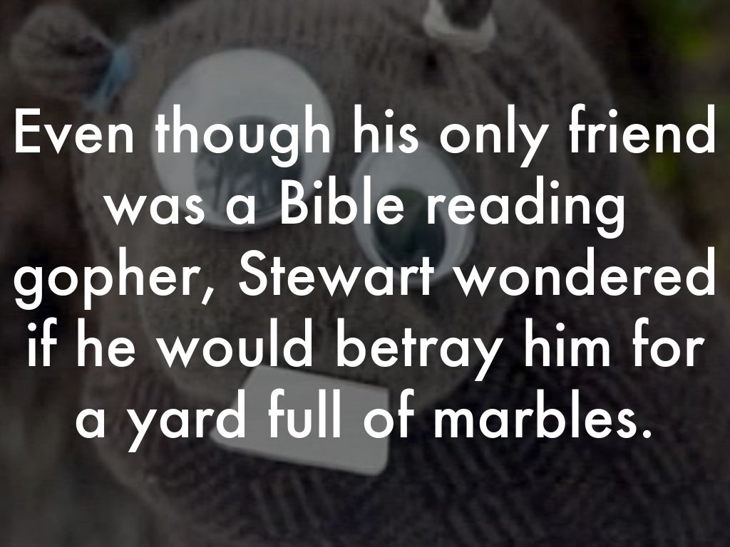 Even though his only friend was a Bible reading gopher, Stewart wondered if he would betray him for a yard full of marbles.