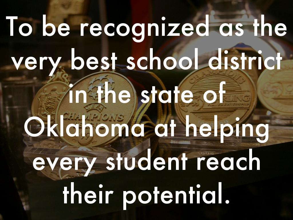 To be recognized as the very best school district in the state of Oklahoma at helping every student reach their potential.