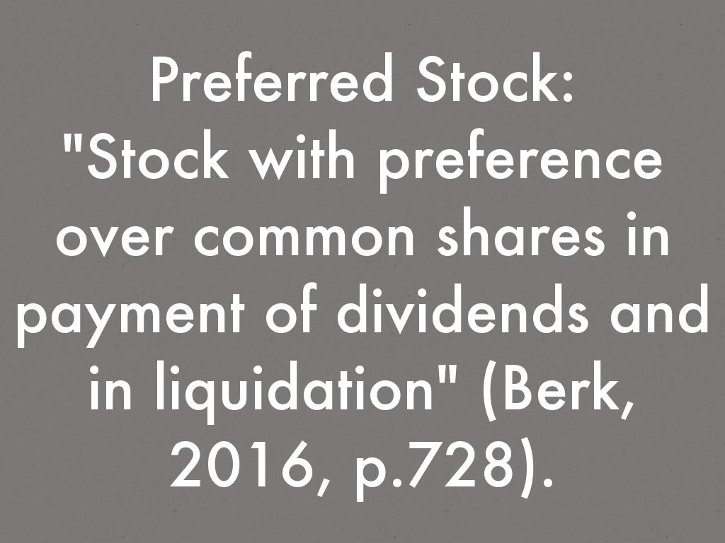 "Stock with preference over common shares in payment of dividends and in liquidation" (Berk, 2016, p.728).