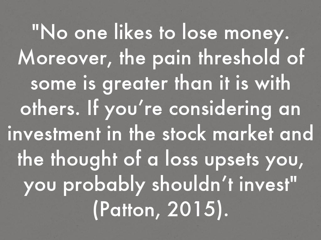 "No one likes to lose money. Moreover, the pain threshold of some is greater than it is with others. If you’re considering an investment in the stock market and the thought of a loss upsets you, you probably shouldn’t invest" (Patton, 2015).