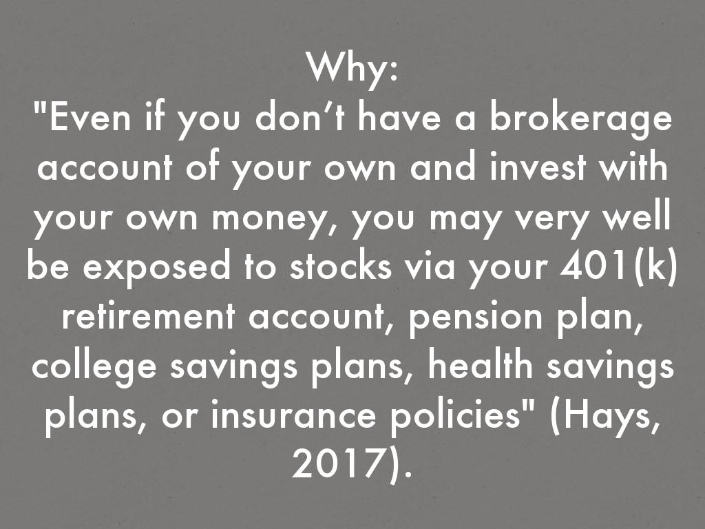 "Even if you don’t have a brokerage account of your own and invest with your own money, you may very well be exposed to stocks via your 401(k) retirement account, pension plan, college savings plans, health savings plans, or insurance policies" (Hays, 2017).