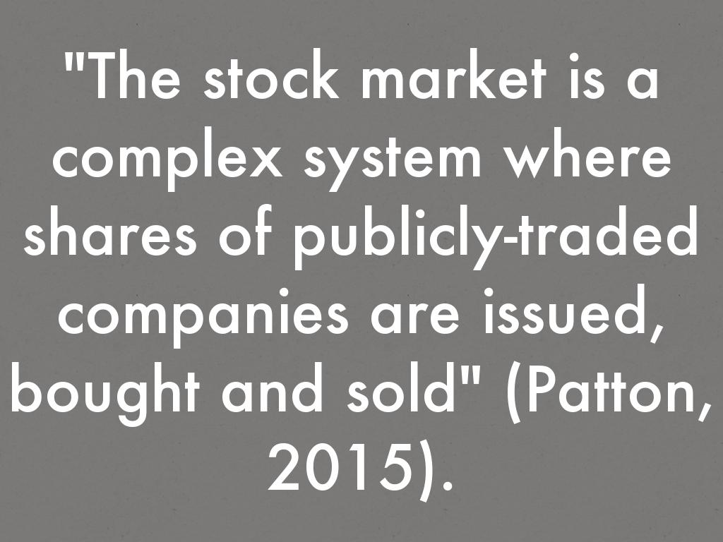 "The stock market is a complex system where shares of publicly-traded companies are issued, bought and sold" (Patton, 2015).