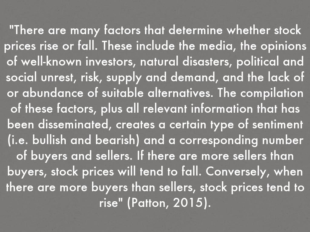 "There are many factors that determine whether stock prices rise or fall. These include the media, the opinions of well-known investors, natural disasters, political and social unrest, risk, supply and demand, and the lack of or abundance of suitable alternatives. The compilation of these factors, plus all relevant information that has been disseminated, creates a certain type of sentiment (i.e. bullish and bearish) and a corresponding number of buyers and sellers. If there are more sellers than buyers, stock prices will tend to fall. Conversely, when there are more buyers than sellers, stock prices tend to rise" (Patton, 2015).