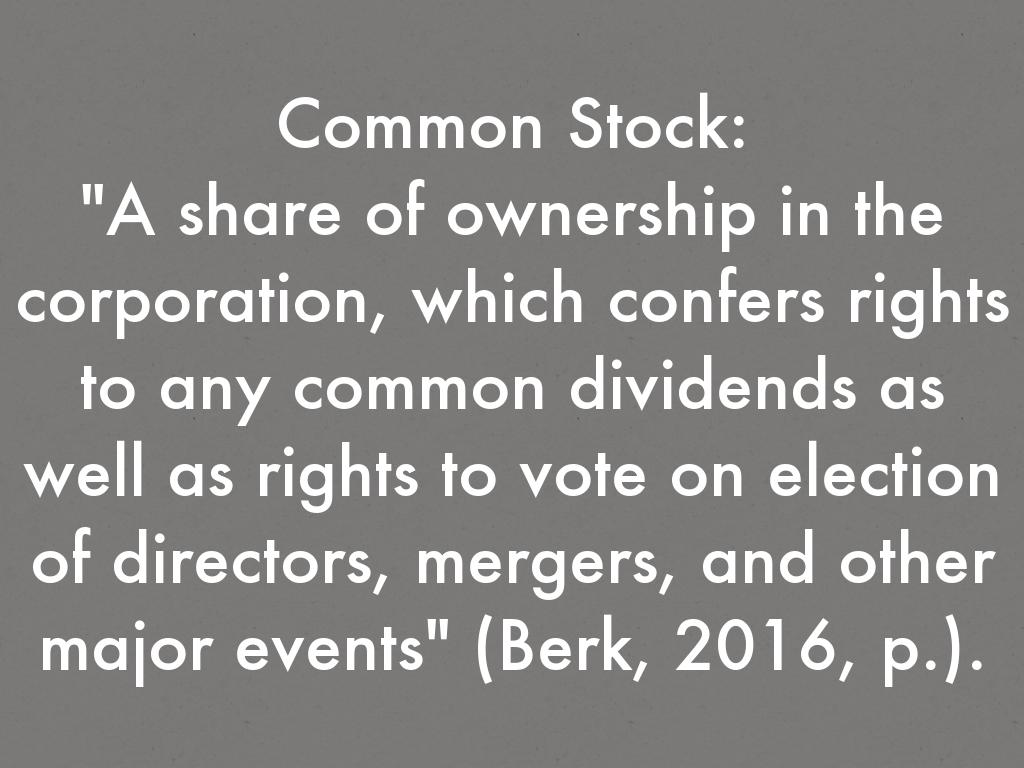 "A share of ownership in the corporation, which confers rights to any common dividends as well as rights to vote on election of directors, mergers, and other major events" (Berk, 2016, p.727).