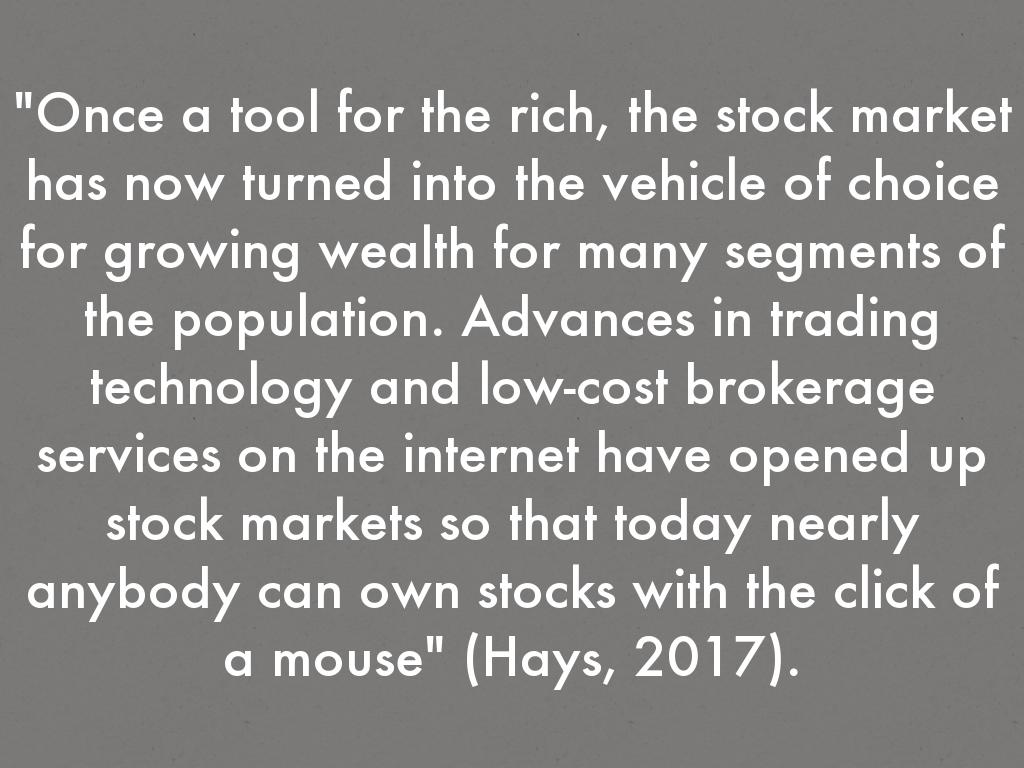 "Once a tool for the rich, the stock market has now turned into the vehicle of choice for growing wealth for many segments of the population. Advances in trading technology and low-cost brokerage services on the internet have opened up stock markets so that today nearly anybody can own stocks with the click of a mouse" (Hays, 2017).