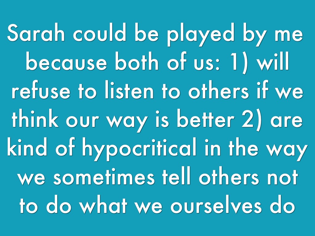 Sarah could be played by me because both of us: 1) will refuse to listen to others if we think our way is better 2) are kind of hypocritical in the way we sometimes tell others not to do what we ourselves do