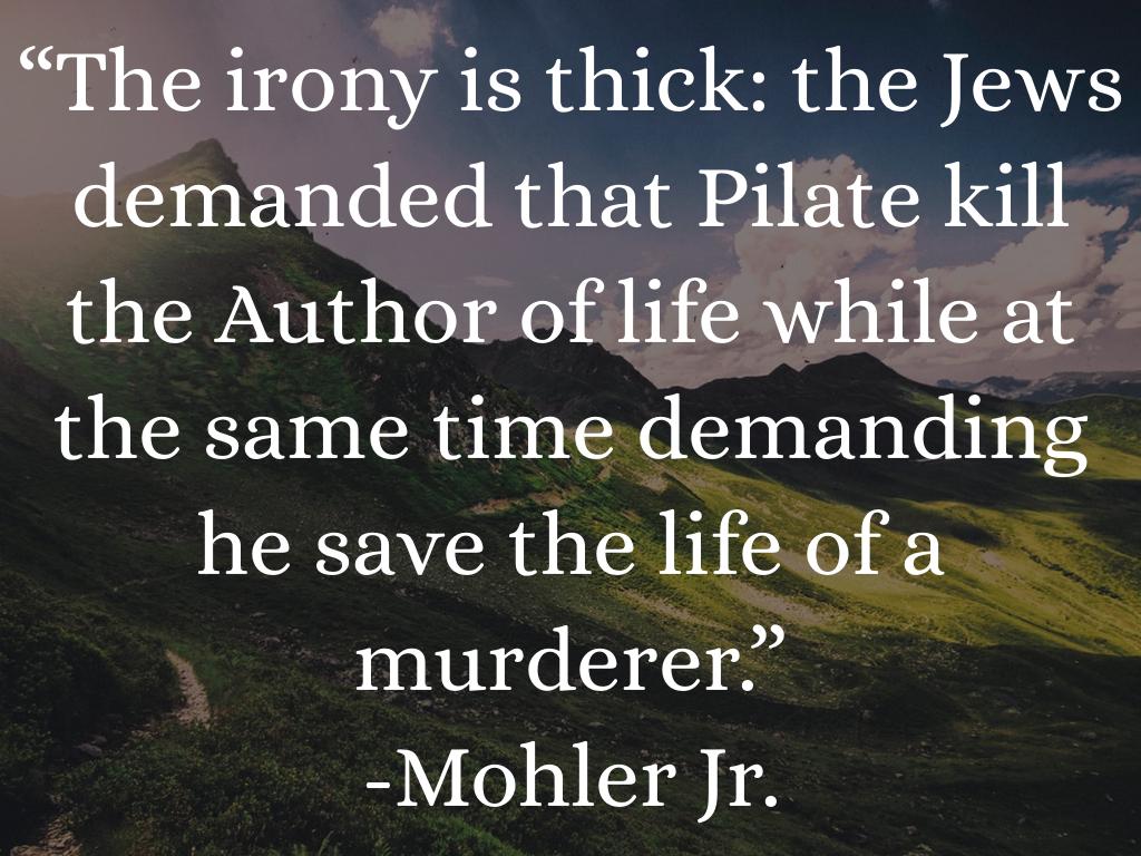 “The irony is thick: the Jews demanded that Pilate kill the Author of life while at the same time demanding he save the life of a murderer.” -Mohler Jr.