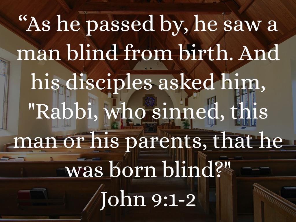 “As he passed by, he saw a man blind from birth. And his disciples asked him, "Rabbi, who sinned, this man or his parents, that he was born blind?" John 9:1-2