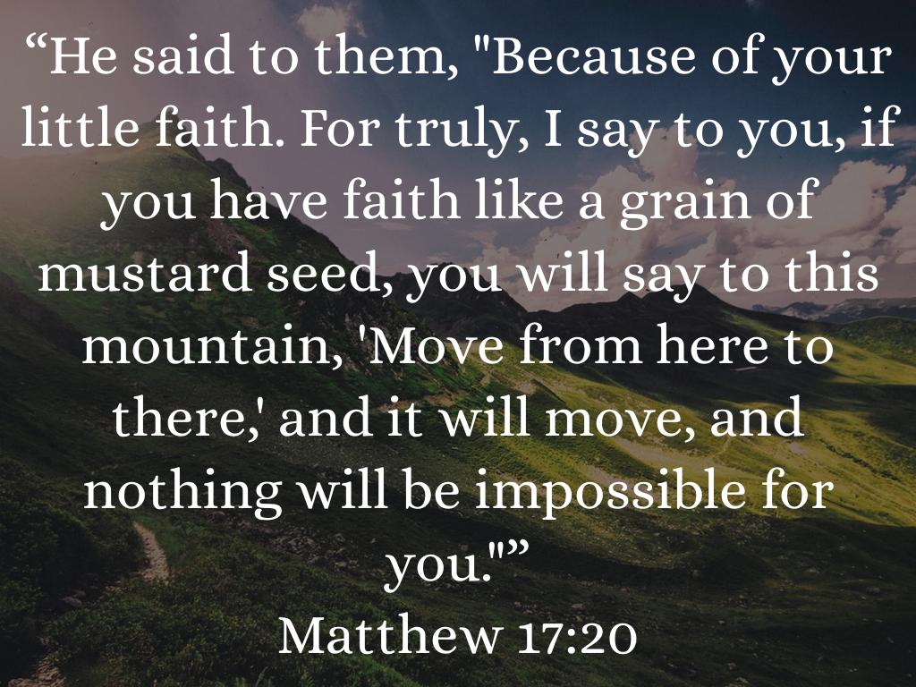“He said to them, "Because of your little faith. For truly, I say to you, if you have faith like a grain of mustard seed, you will say to this mountain, 'Move from here to there,' and it will move, and nothing will be impossible for you."” Matthew 17:20