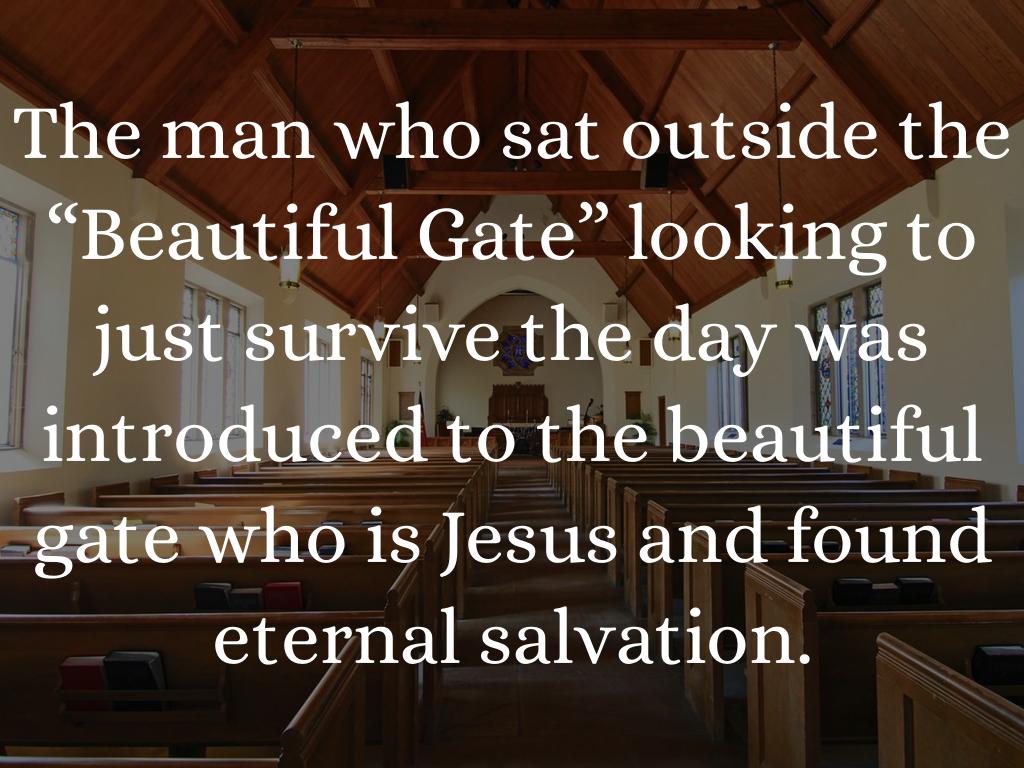 The man who sat outside the “Beautiful Gate” looking to just survive the day was introduced to the beautiful gate who is Jesus and found eternal salvation.