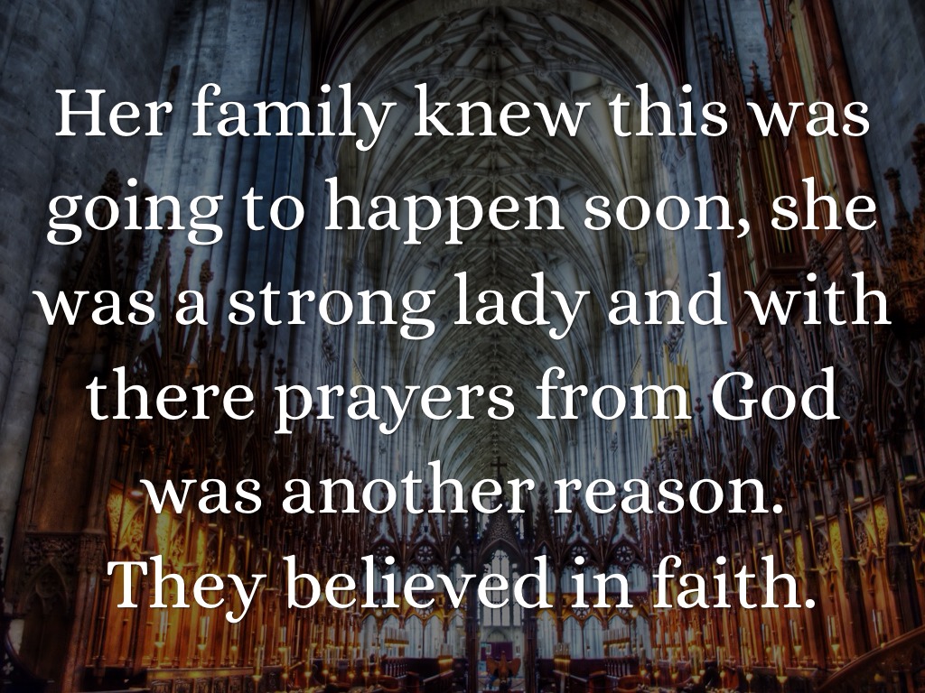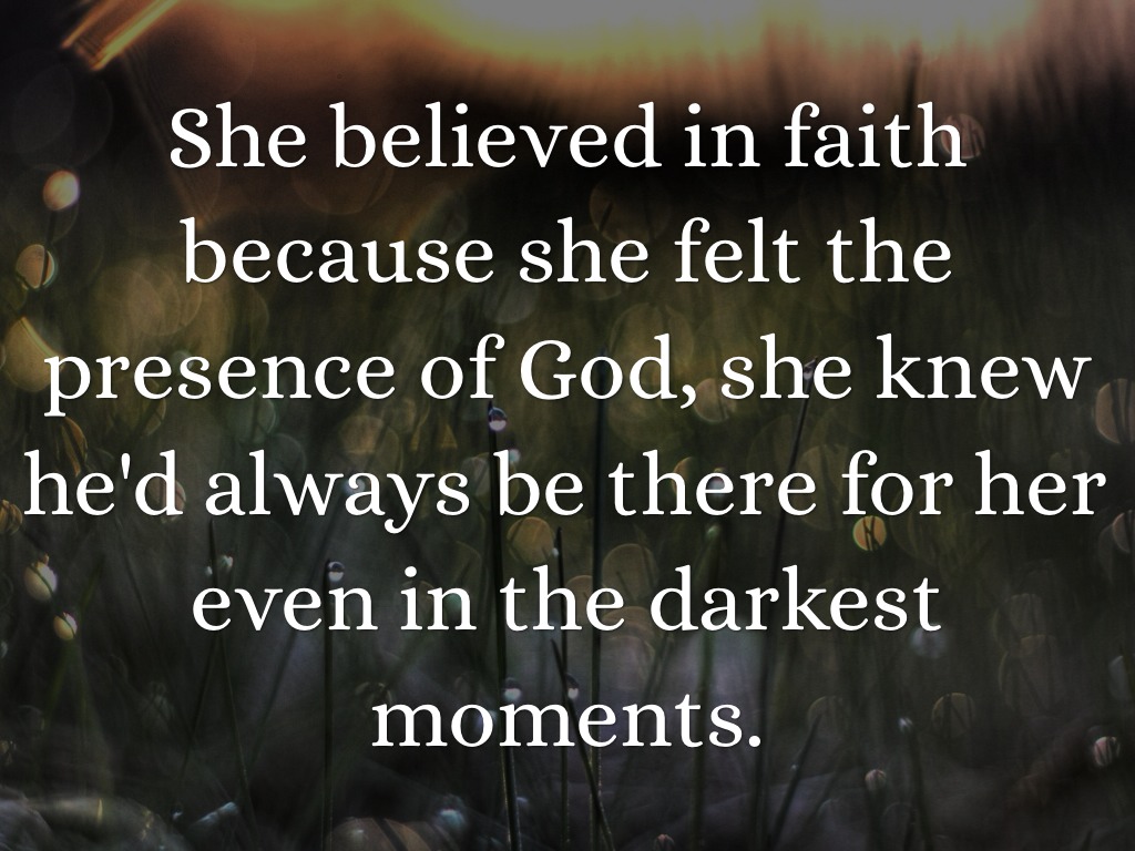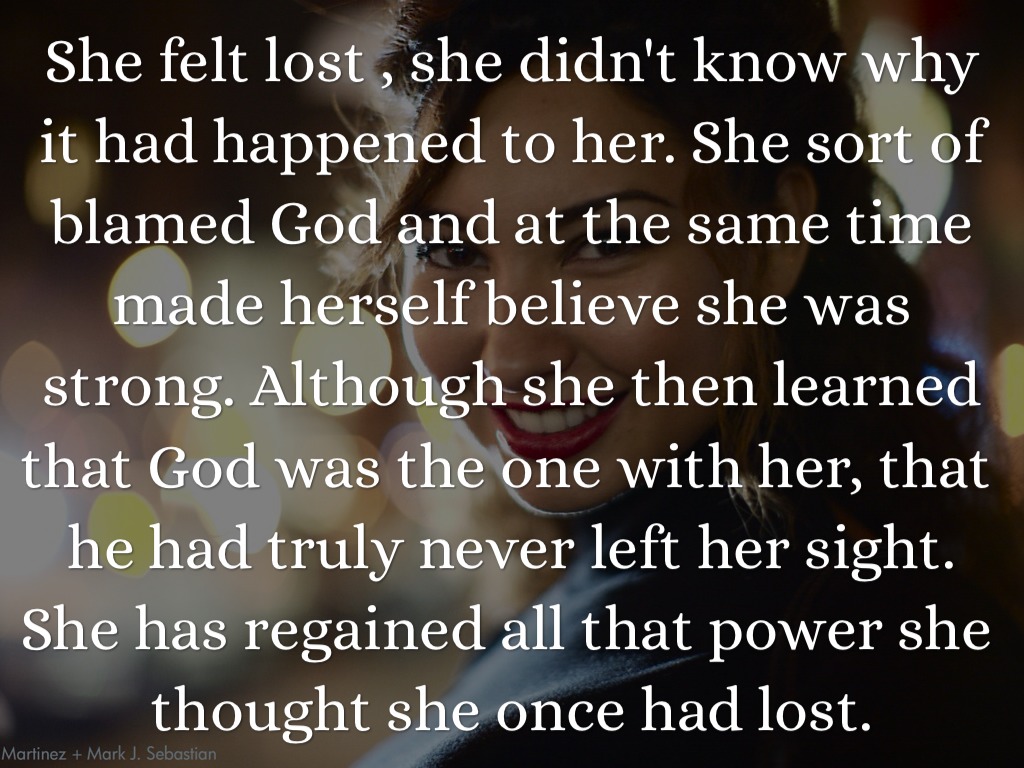She felt lost , she didn't know why it had happened to her. She sort of blamed God and at the same time made herself believe she was strong. Although she then learned that God was the one with her, that he had truly never left her sight. She has regained all that power she thought she once had lost.