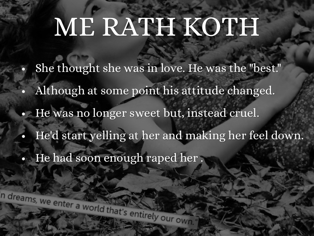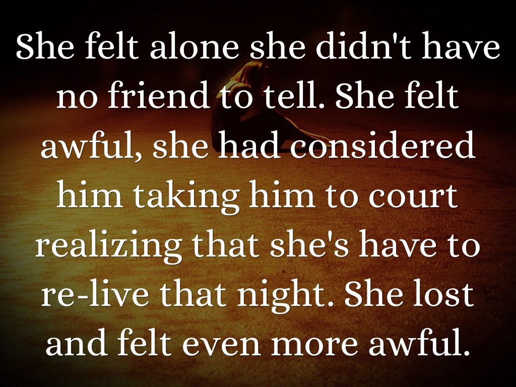 She felt alone she didn't have no friend to tell. She felt awful, she had considered him taking him to court realizing that she's have to re-live that night. She lost and felt even more awful.