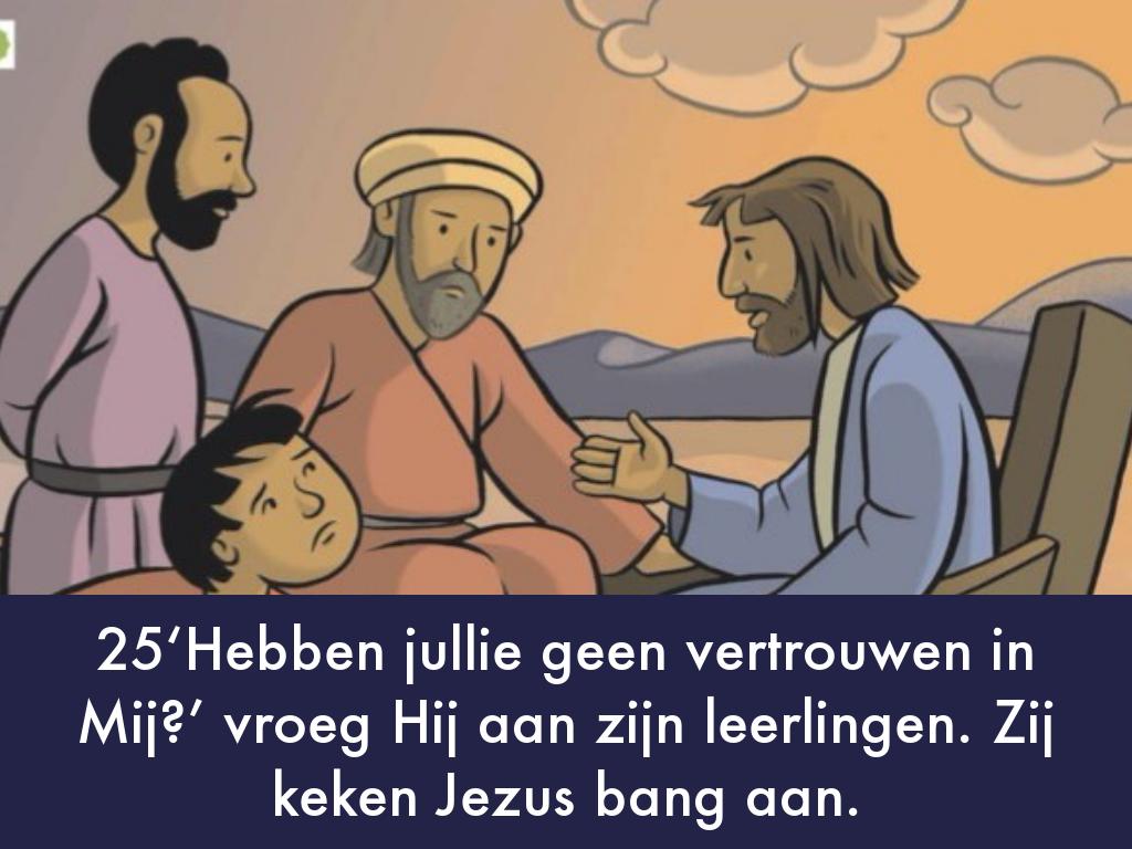 25‘Hebben jullie geen vertrouwen in Mij?’ vroeg Hij aan zijn leerlingen. Zij keken Jezus bang aan.