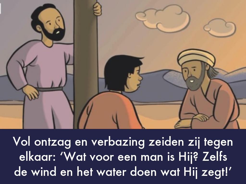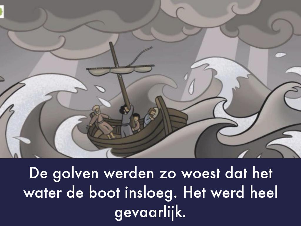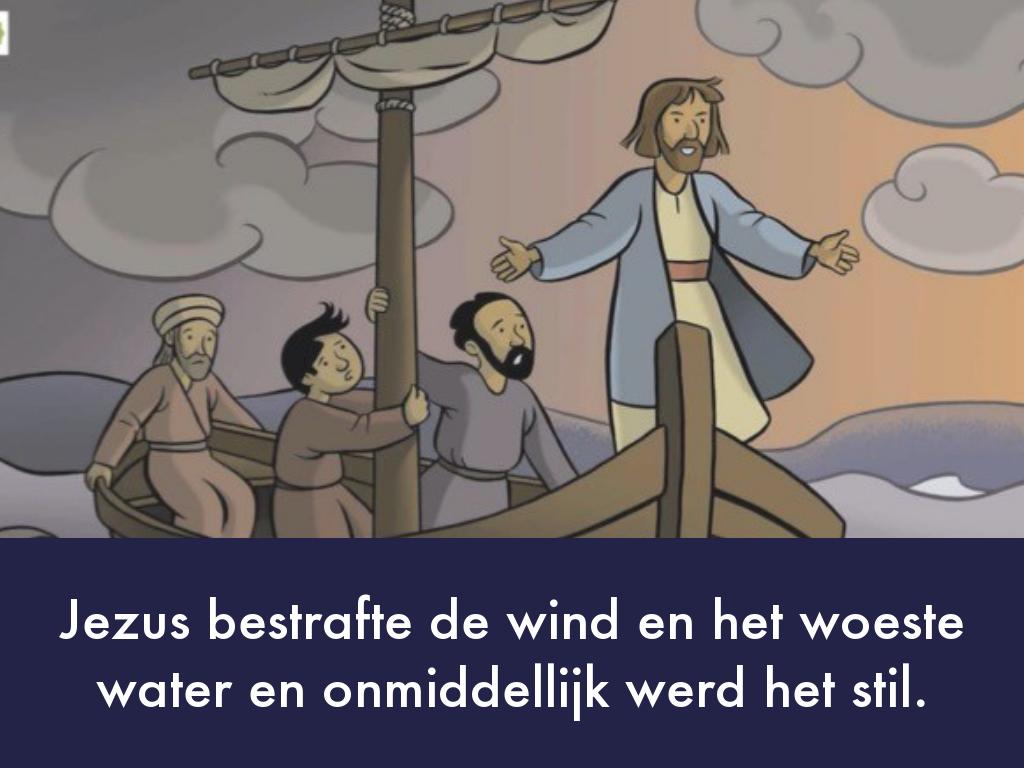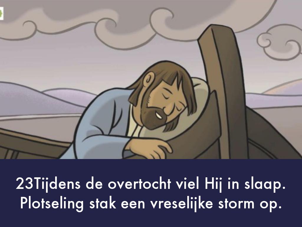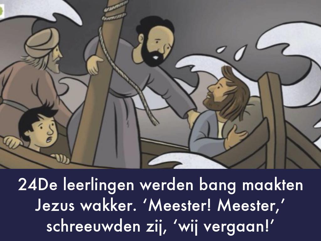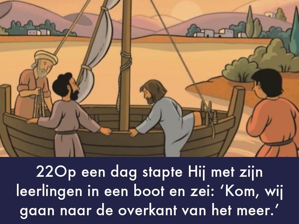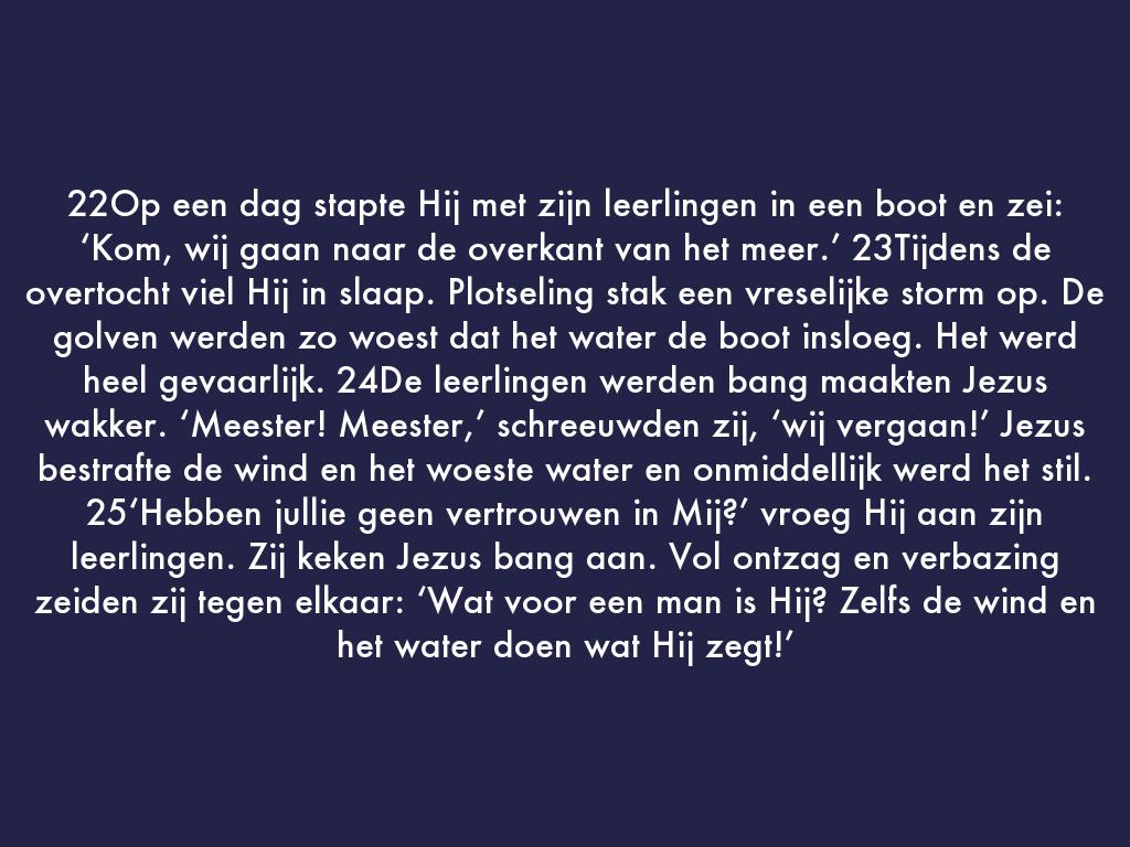 22Op een dag stapte Hij met zijn leerlingen in een boot en zei: ‘Kom, wij gaan naar de overkant van het meer.’ 23Tijdens de overtocht viel Hij in slaap. Plotseling stak een vreselijke storm op. De golven werden zo woest dat het water de boot insloeg. Het werd heel gevaarlijk. 24De leerlingen werden bang maakten Jezus wakker. ‘Meester! Meester,’ schreeuwden zij, ‘wij vergaan!’ Jezus bestrafte de wind en het woeste water en onmiddellijk werd het stil. 25‘Hebben jullie geen vertrouwen in Mij?’ vroeg Hij aan zijn leerlingen. Zij keken Jezus bang aan. Vol ontzag en verbazing zeiden zij tegen elkaar: ‘Wat voor een man is Hij? Zelfs de wind en het water doen wat Hij zegt!’