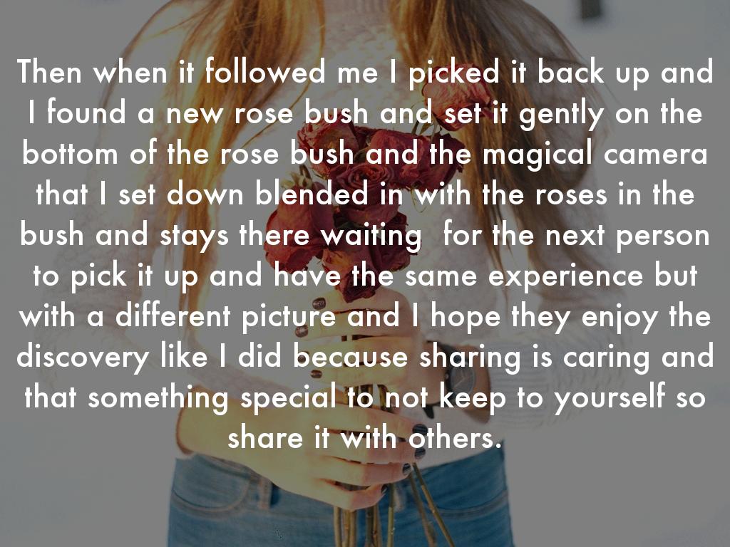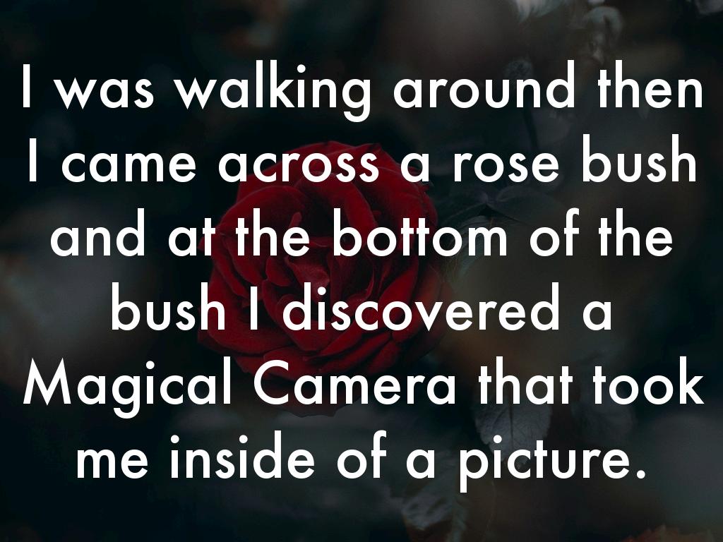 the Magical Camera look liked the roses petals that fall down from the rose then the Magical Camera took me back to the place I was walking around when I took it back to a field that was filled of grass and then I put the Magical Camera down and when I walked away and the Magical Camera followed me.
